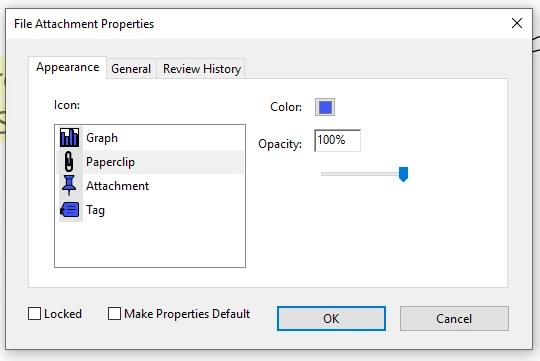 - In the File Attachment Properties dialog box, select the settings for the file icon that appears in the PDF.