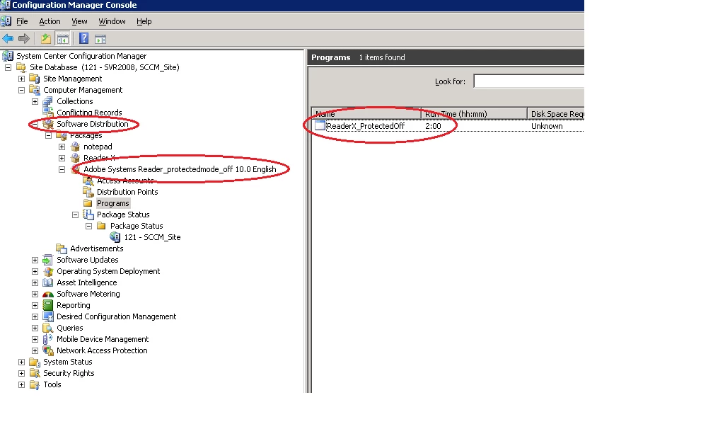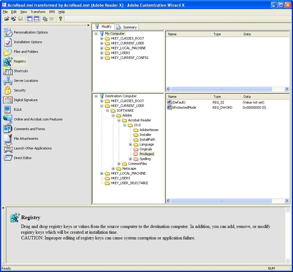 I am deploying Adobe Reader X by Microsoft System Centre Configuration Manager. I have created a package using the Customisation Wizard. I have 3 Registry changes included. 1, Change unts from inches to centimeters. 2. Change spelling dictionary from US to UK. and 3. uncheck the "Enable Protected Mode at startup" option. Our workstations are Windows XP SP3. The problem is that although the units and spelling options are passed through on installation the "Enable Protected Mode at startup" does not. I can see it creates the registry key successfully in the S-1-5-18 registry location but when I launch Adobe Reader for the first time the Privileged key is created but fails to pass the REG_DWORD called bProtectedMode from the S-1-5-18 registry location to the HKCU registry hive. Does anyone have any idea why this happens and how to fix it? I need this option unchecked as PDF documents on some network drives fail to open citing "Access Denied" if it is checked. Any help appreciated. Wayne