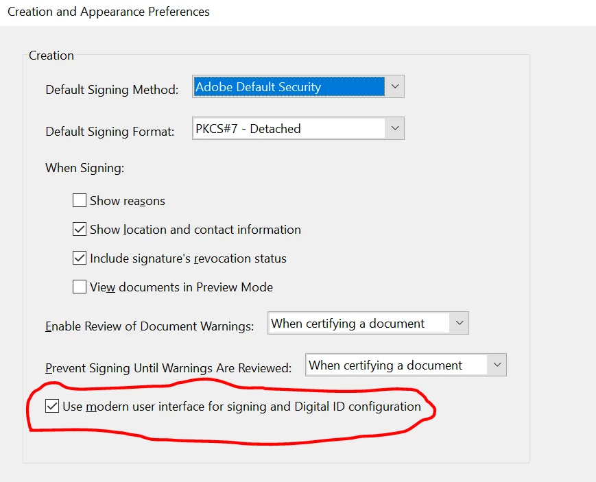 Go to Edit (Windows), Adobe Acrobat (Mac) > Preferences > Signatures > Click 'More' under 'Creation and appearance' > Uncheck 'Use modern user interface' as shon below: