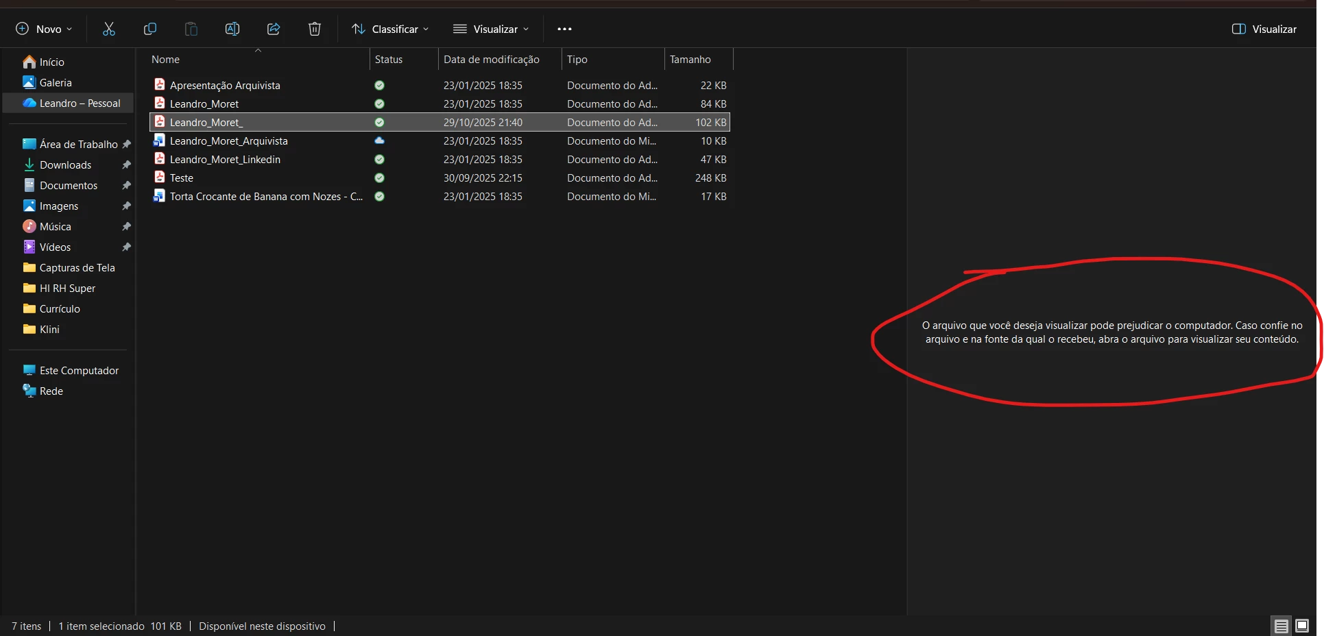 Alguns documentos PDFs não exibem mais a pré visualização, no lugar, aparece uma mensagem informando que o arquivo pode danificar o computador, e que, caso confie no arquivo e na fonte, tenho que abrir para visualizar seu conteúdo. Porém, são documentos que eu mesmo fiz e/ou baixei de diversas fontes. E aparece esse mesmo erro de pré visualização. Como corrigir e voltar a ver a visualização sem necessáriamente precisar abrir o arquivo?