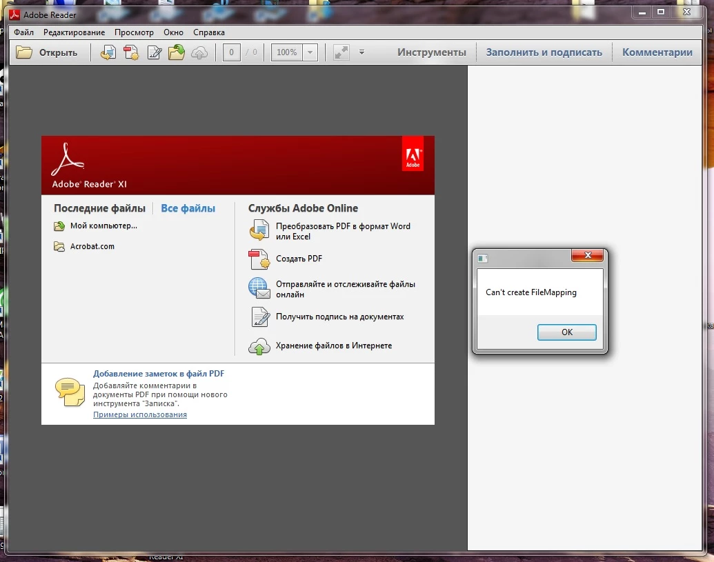 После очередного автоматического обновления Acrobat Reader DC стал при запуске выдавать ошибки "Can not create filemapping" и "MapViewOfFile".