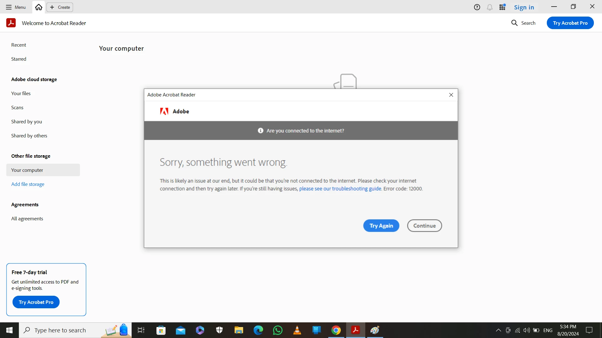 @zane_9634 In short, Adobe Acrobat Reader is telling you it can't complete an action, most likely because it needs an internet connection and either yours is down, or there's a problem on Adobe's side. You can check to see if there are any maintenance being done, https://status.adobe.com