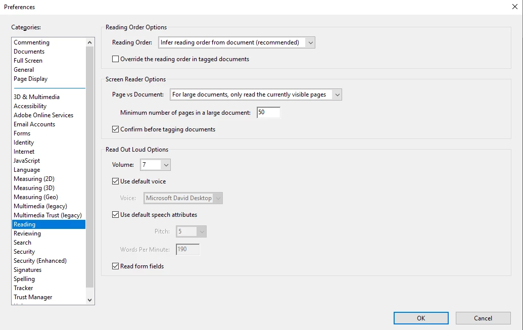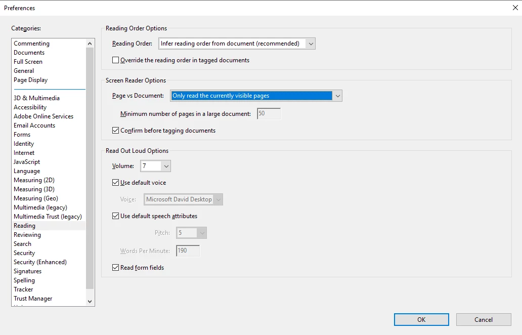3. Under the Screen Reader Options group box, under Page vs Document, select Only read the currently visible pages.