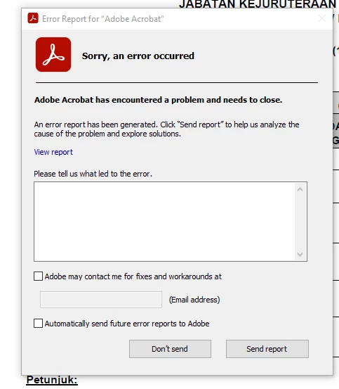 Everytime I attempt to use Fill and Sign, the Error Report box appear. And after the report is sent (or don't sent), the adobe acrobat windows is closed automatically. I've tried uninstall and reinstall Adobe Acrobat, but the problem still remain.