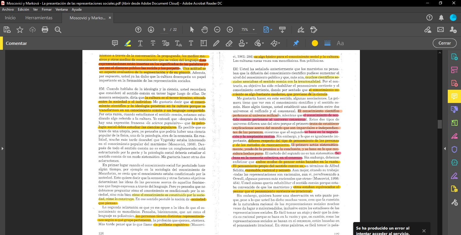 Resalte todo un pdf y cuando lo quiero guardar en la nube me salta un cartel que dice "se ha producido un error al intentar acceder al servicio"