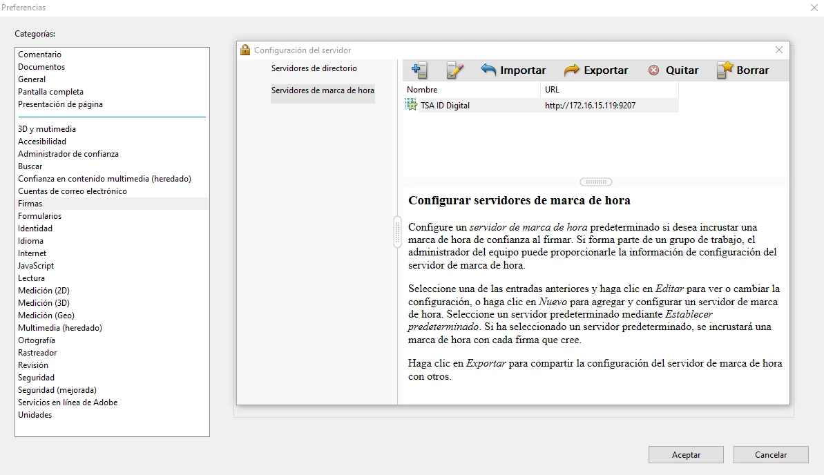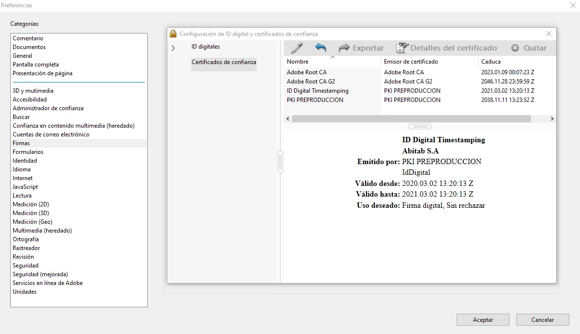 We are having trouble signing with a time stamp in Adobe Acrobat Reader DC version 2020.009.20067. At the end of the signature with the time stamp after selecting the location where to save it, it shows the following error message "Error during signature: Certificate not valid for use" (attached image of the error)