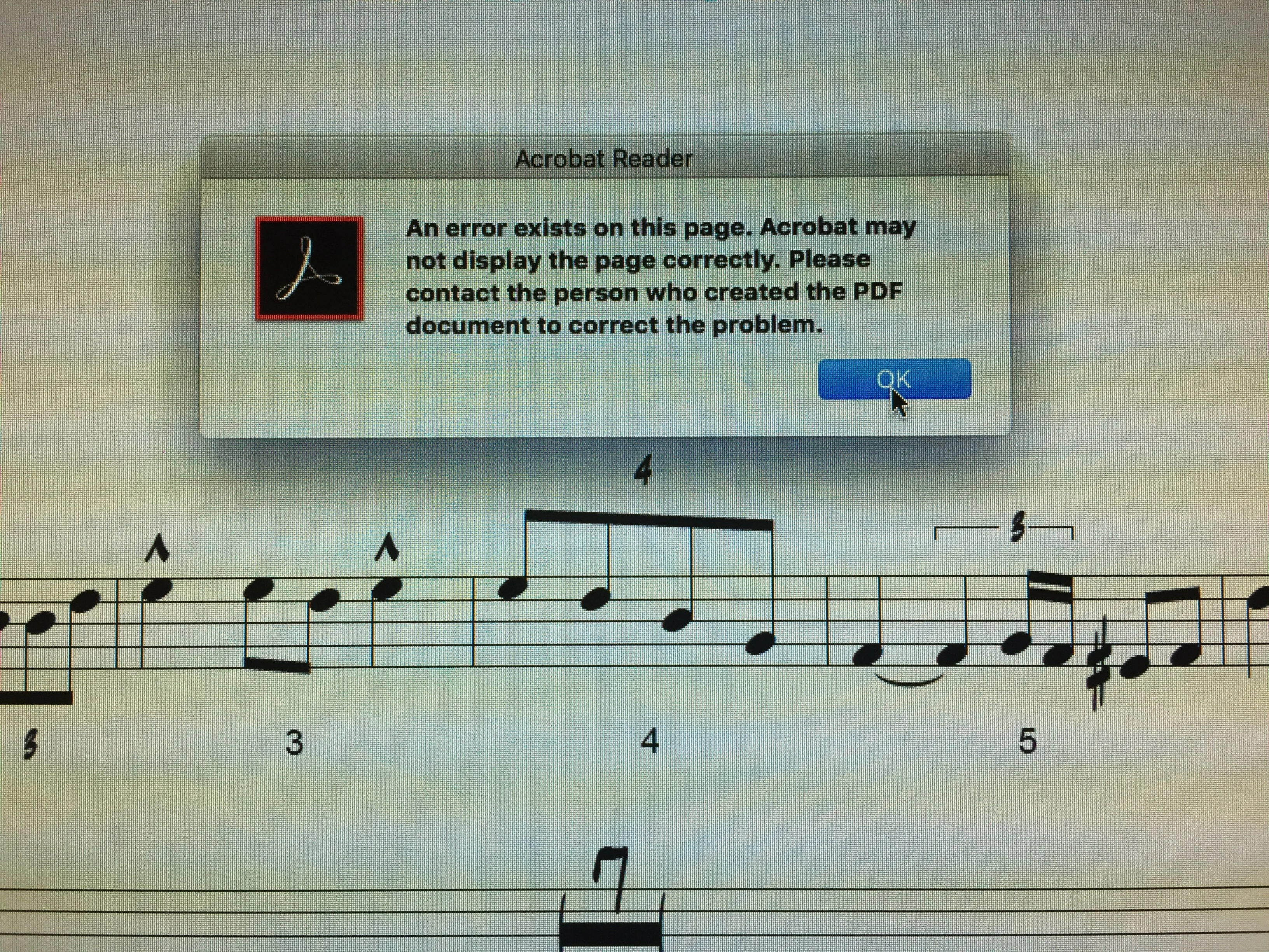 I'm a musician that uses the music notation software program Finale to create music. I have always automatically generated PDF versions of my work from that application and on several random files I keep getting this message when I open the PDF files that I have just created: