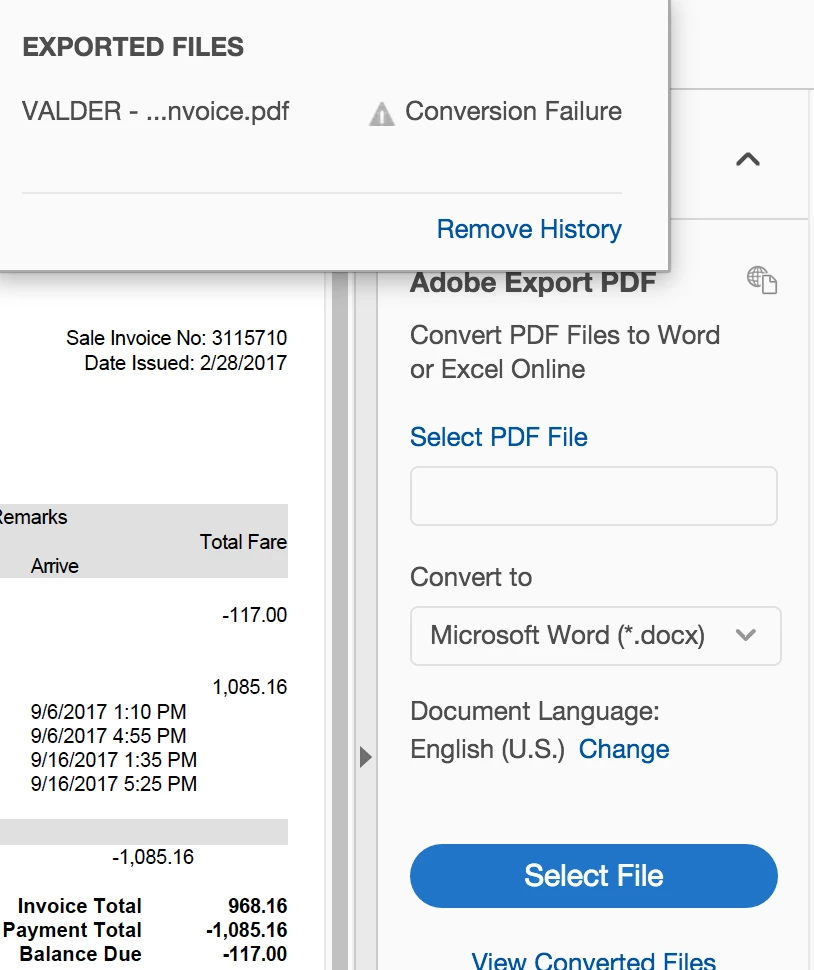 Hi, I keep getting an error message when I try to convert a file from PDF to WORD. See below. I have tried quitting the application and opening it again.