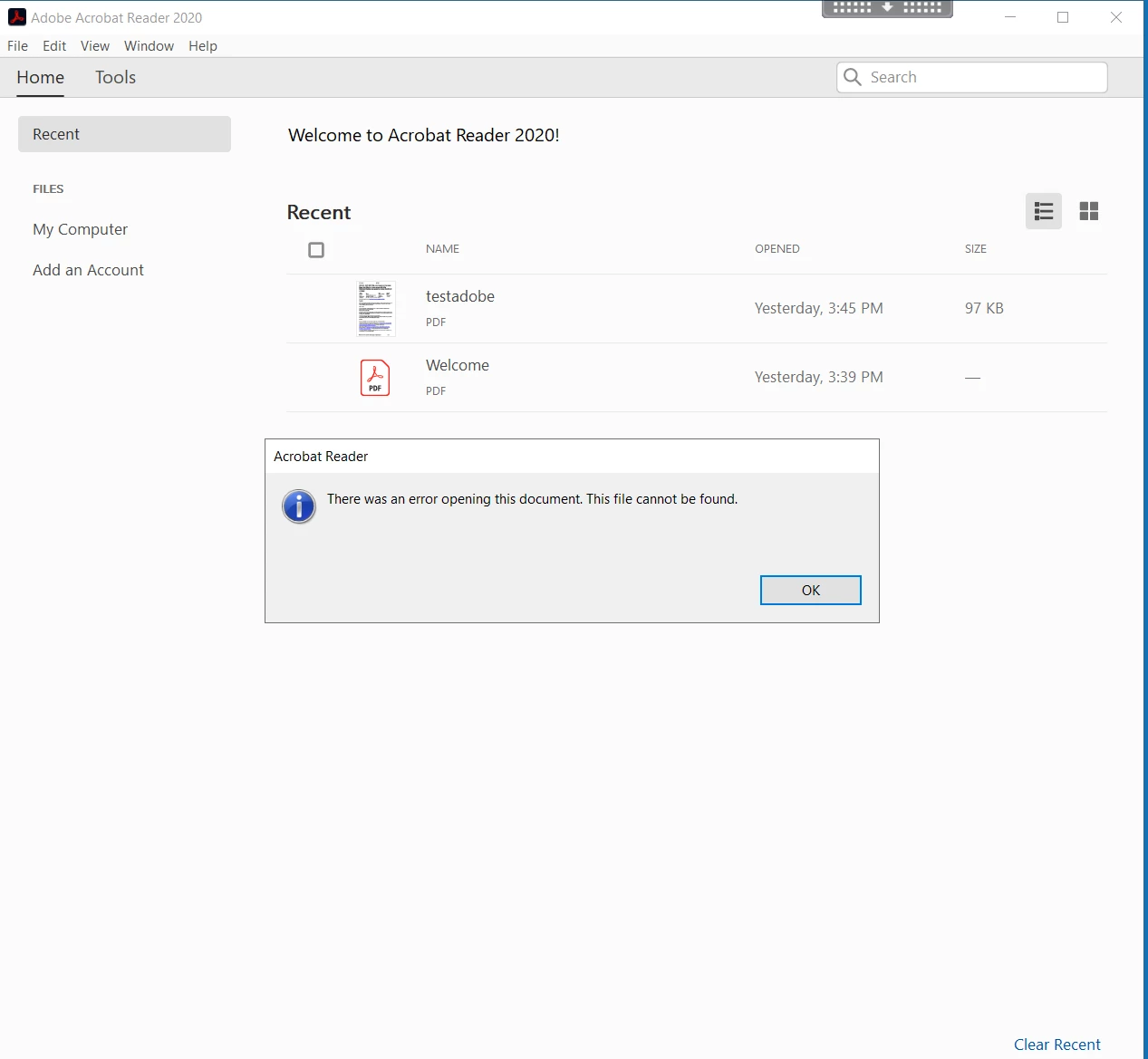 In our Citrix XenApp environment running Windows Server 2019 we are unable to open PDFs directly from the Open button (or double-click). There is the error - There was an error opening this document. This file cannot be found.