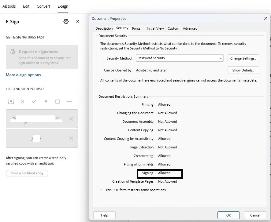 I have a protected PDF file with unlocked form editing and signing (lock sign -> security info). Editing is allowed, while signing is blocked and grayed out (although it works for unprotected PDFs). I am using the Adobe Reader Pro trial version.