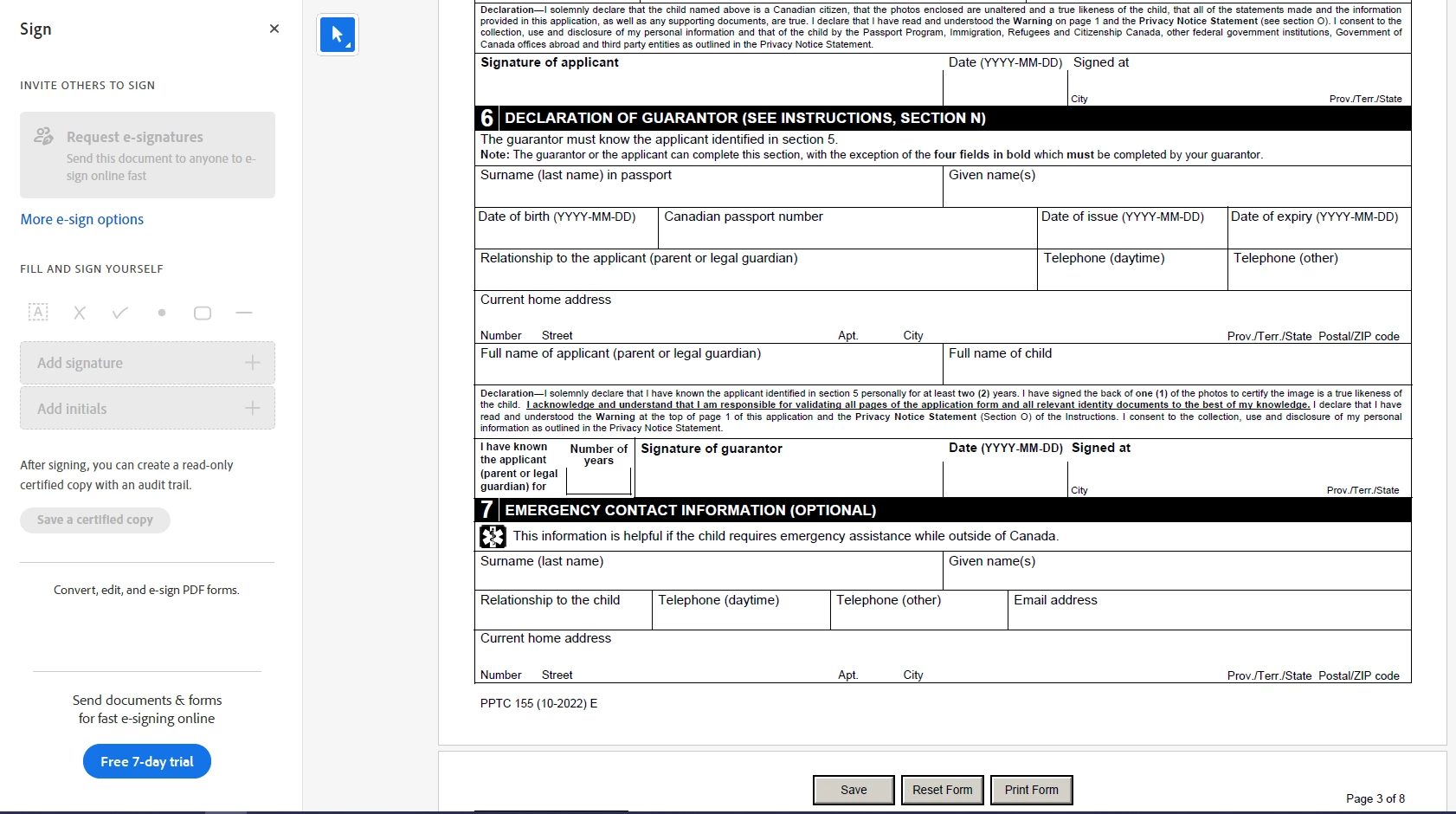I'm trying to fill out a passport application PDF in Canada. The PDF is fillable when I open it from link after it opens in my browser. However, once I download it and open it in Adobe Acrobat Reader, aside from a few buttons to save, reset, or print the form (or read instructions), the PDF is "flat" - nothing is fillable. I could only print it and fill it out by hand. In the browser version I can enter data but it doesn't save - I would have to print it immediately. And of course, I cannot add a signature.