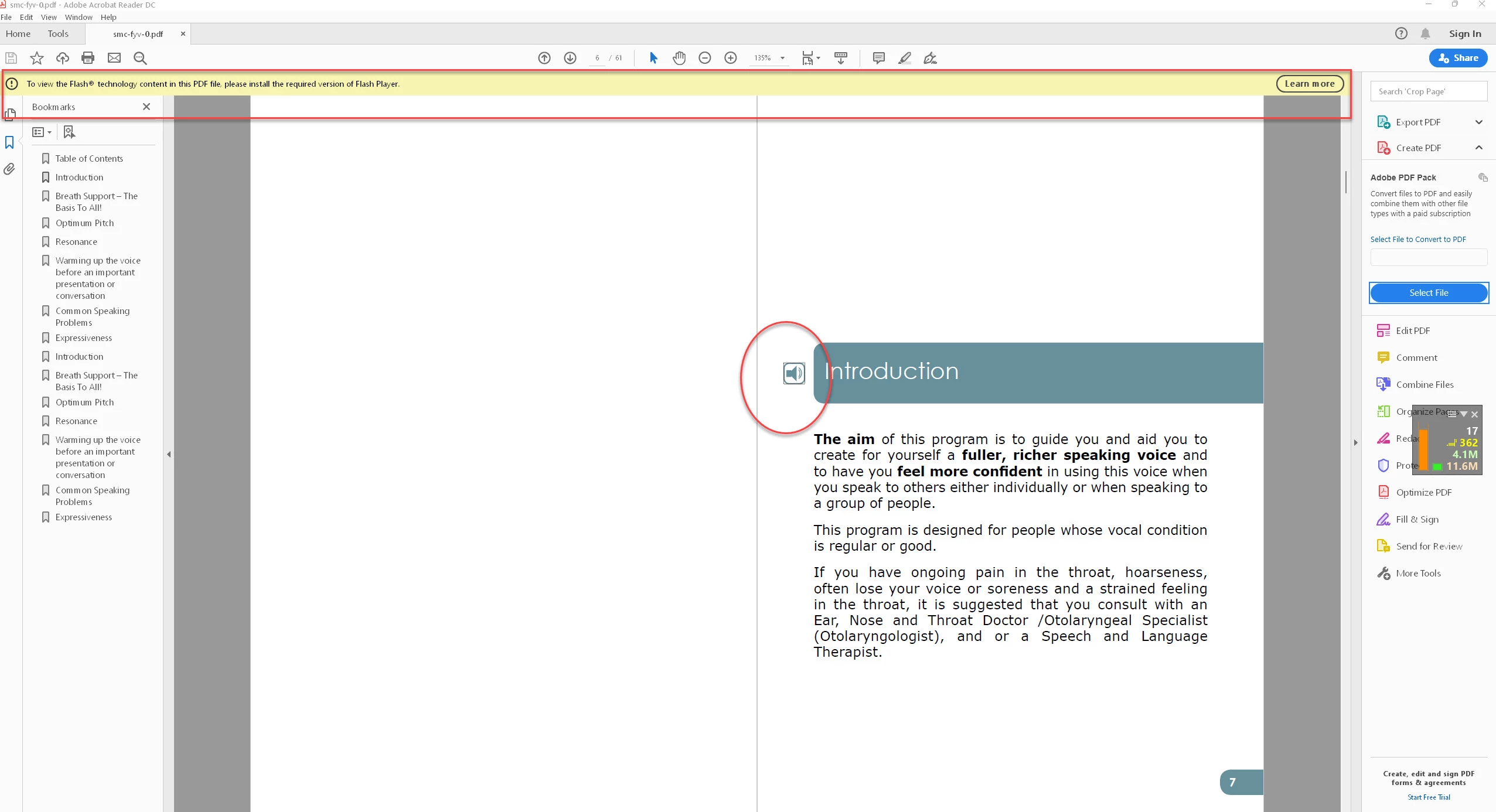 I have a PDF file that needs a flash player to play some audio materials.