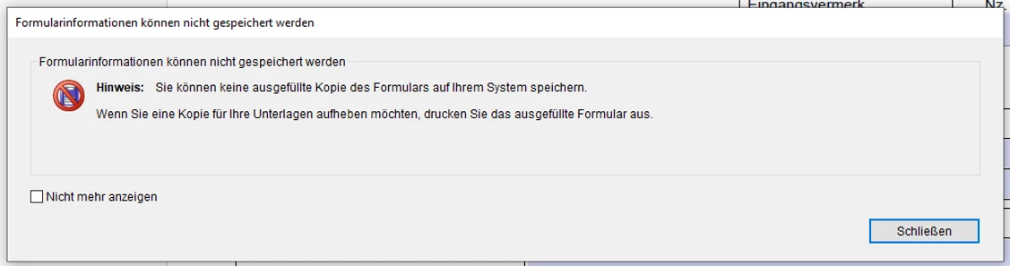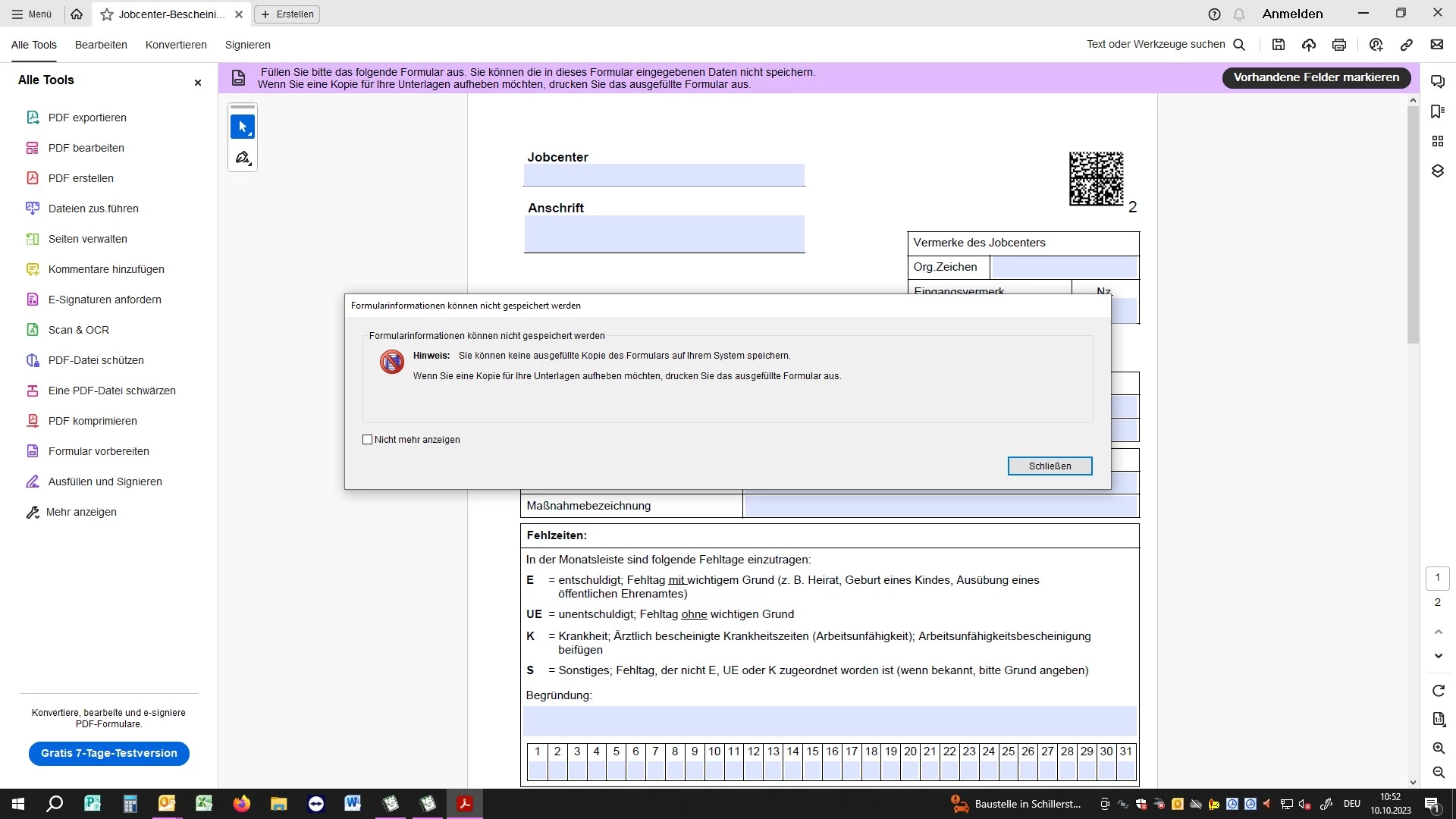 vom Jobcenter haben wir PDF-Formulare, die wir für Fehlzeiten mit dem Adobe Reader ausfüllen wollen. Beim bearbeiten und speichern der Formulare kommt jedoch diese Fehlermeldung:
