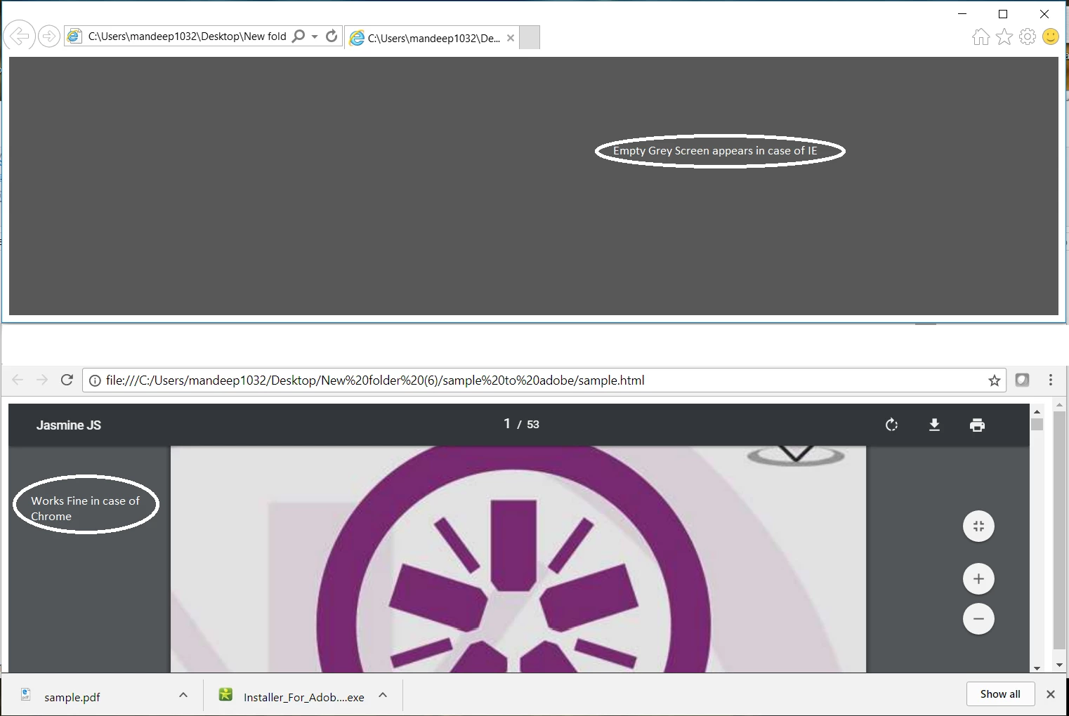 No problems in Chrome because it uses Chrome PDF Viewer rather than Adobe Reader, perhaps?