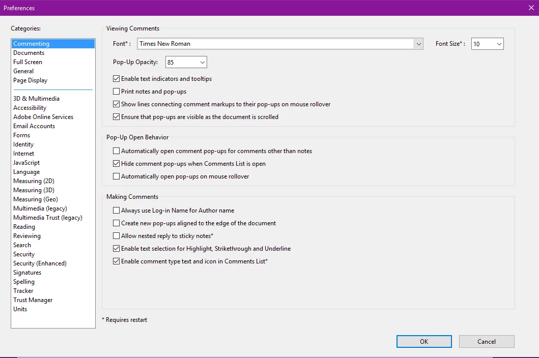 This is my preferences pane. It's always been in these settings. And the Automatically open comments pop-ups for comments other than notes has never been selected. It only started happening after the last upgrade. Acrobat had never done this before. I usually had to double click on the highlight to open the pop-up if I wanted to add a comment. Most of the time I just need to highlight so this is really annoying and I need it gone.