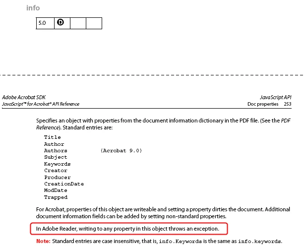 In addition, there are some properties that are Read/Write in Acrobat, but Read-Only in Reader. That will appear in the property's description. For example: