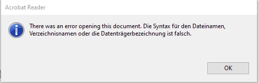 window.location.replace("acrobat://C:/path/to/file.pdf") opens the Acrobat Reader correctly but it always claims that the syntax is wrong. Initially I try to open a file from SharePoint via Webdav but that seems to be the second step. The simple example from above does not work. What is the correct syntax? I searched the whole internet for an answer but was not succesfull. Help is very much appreciated!