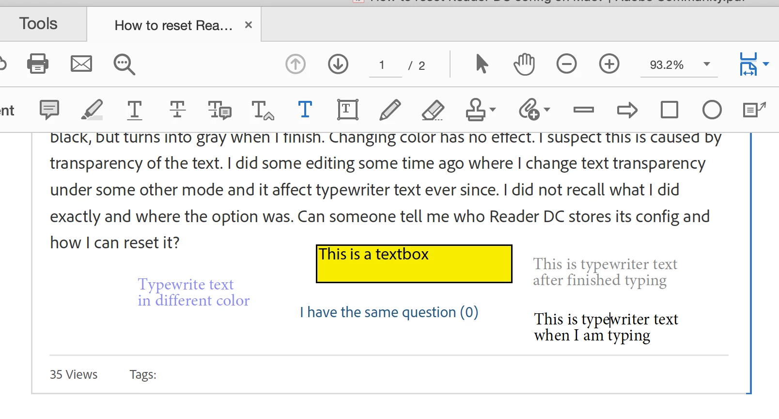 Comment text entered via typewriter shows up in light gray color. When I type it in, the color is black, but turns into gray when I finish. Changing color has no effect. I suspect this is caused by transparency of the text. I did some editing some time ago where I change text transparency under some other mode and it affect typewriter text ever since. I did not recall what I did exactly and where the option was. Can someone tell me who Reader DC stores its config and how I can reset it?