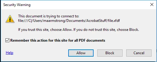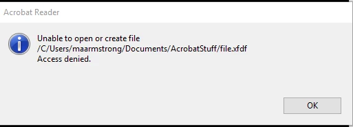 Again, the location looks odd. It should look like: C:/Users/maarmstrong/Documents/AcrobatStuff/file.xfdf