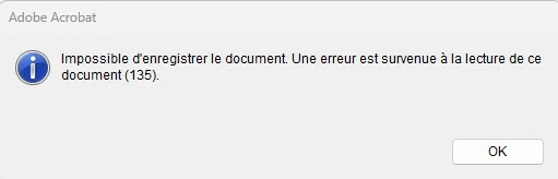 Impossible d'enregistrer le document. Une erreur est survenue à la lecture de ce document (135)