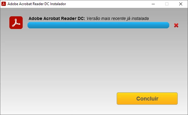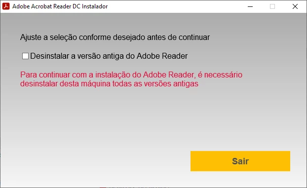 1º Tento instalar o Adobe Reader versão mais atualizada 11/2022: Veja o que ocorre: De cara, o sistema diz que tem uma verão mais antiga instalada: Porém não é possível enxerga-la no painel de controle. Eu marco a seleção para desinstar e continuar.