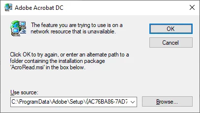 Aos 85% o sistema emite esta mensagem: Parace que está procurando o desinstalador AcroRead.msi da versão. E não encontra. E não deixa instalar um nova versão...Tenho que cancelar a operação e abandonar.