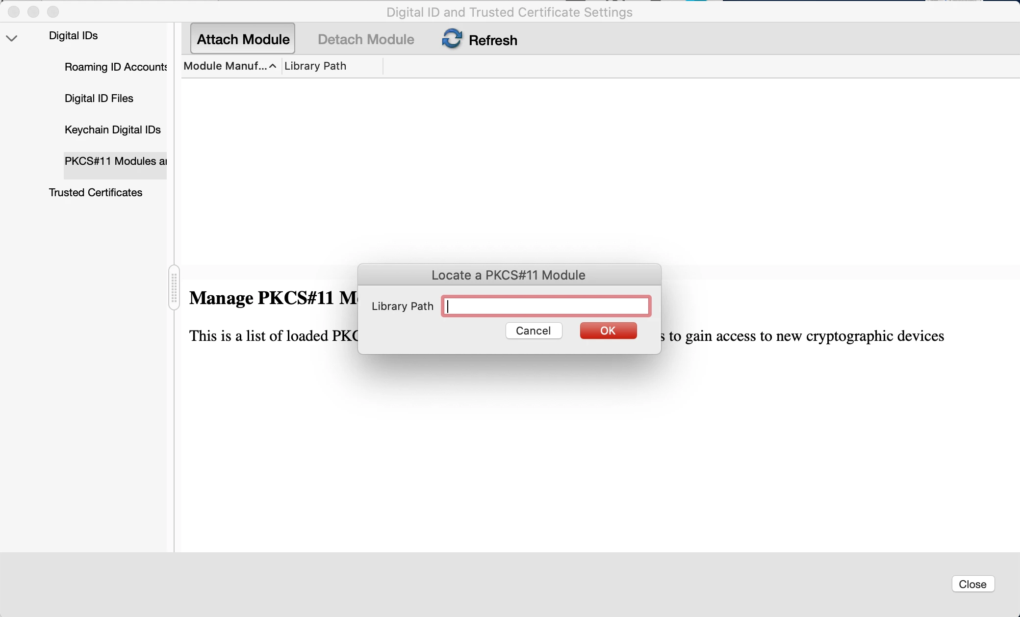 Following that I tried checking these forums but it was all outdated information and nothing seems to work. I have tried to manually add the PKCS#11 Module to see if that worked but it didn't work. I don't know what to add there: