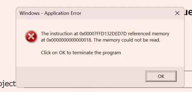 Memory could not be read 0x00007FFD132DED7D at 0x000018