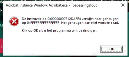 Application popup: Acrobat Instance Window: Acrobat.exe - Toepassingsfout : De instructie op 0x000000006DD8AFF4 verwijst naar geheugen op 0x0000000000000090. Het geheugen kan niet worden read.