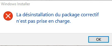 J'ai des ennuis avec Adobe Acrobat Reader : que j'essaie de réparer l'application , de la désinstaller ou de la télécharger, il se produit un échec et le message suivant apparaît : "La désinstallation du package correctif n'est pas prise en charge." (voir photo jointe). Je suppose que l'un des fichiers système a été malencontreusement effacé ou endommagé.