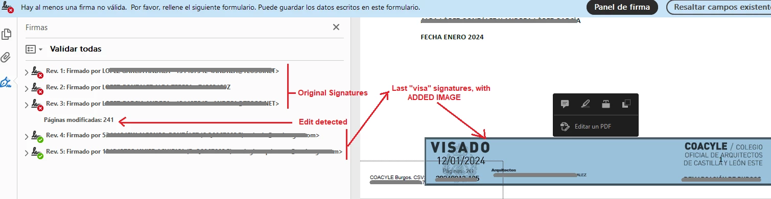 we received PDF documents from arquitects and this kind of professionals. This kind of documents have 2 group of signatures: