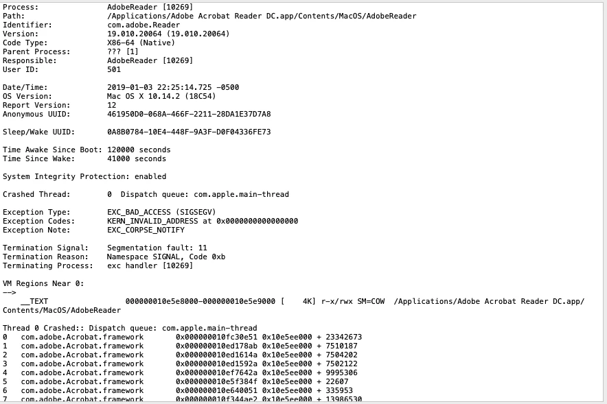 Since last 2 week, once I open any PDF file, within 3 seconds, the file will close itself unexpectedly & then the following error message(picture attached) comes up, I deleted my current Adobe & redownloaded the latest version from adobe.com, but the problem remain. I am currently using Mac latest Mojave 10.14.2.