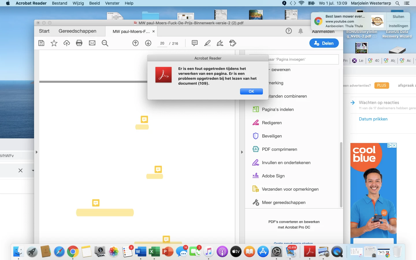 I was working on an pdf, highlighting text and remarks. When i wanted to save the pdf with the remarks, the text of the whole document diappeared. It says error 109. How can I get my text back?