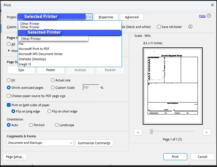 I navigate to an outlook email and open the PDF attachment sent. By default the document opens to Adobe. When in Adobe I select the highlighted printer button on the top right hand corner to print. The print preview window will open. On the print preview window when I select print on the bottom right hand corner the select a printer dropdown menu opens even though a default printer is set. Even if a printer is selected if I navigate to the print button on the bottom left hand corner the printer dropdown menu continues to expand once again. Each time the print button is selected it will expand the printer dropdown menu and not print the document. We have used numerous network printers and print to PDF and we get the same behavior. This is happening in integrated programs as well when trying to print a PDF. The only way to currently print a PDF is to save the PDF locally to desktop, downloads, etc. following the same steps navigating to the printer button and selecting print on the print preview window in Adobe.