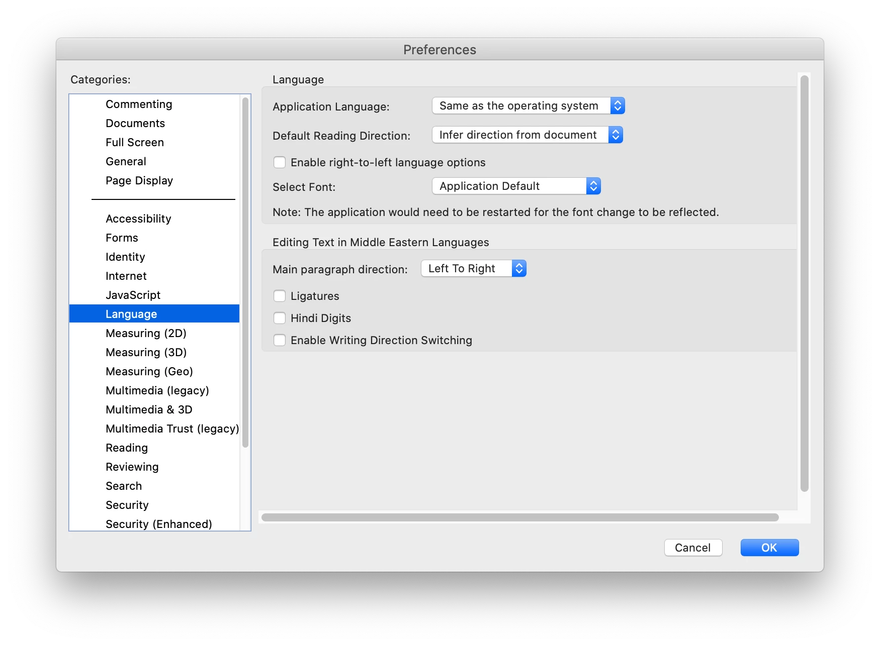 in my Mac (OS 10.15), I cannot find an option to change the language. Preferences > Language > Application Language only gives me option to "Same as the operating system". Any ideas? I need this in order for my digital signature to appear in Spanish, not the OS language (English in my case). Thanks!