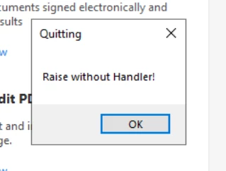 When I install DC Pro the two users can print without any problems. When I install Acrobat Reader, I am getting quite a few errors. On the first run, I get a pop up of Quitting - Raise without Handler!