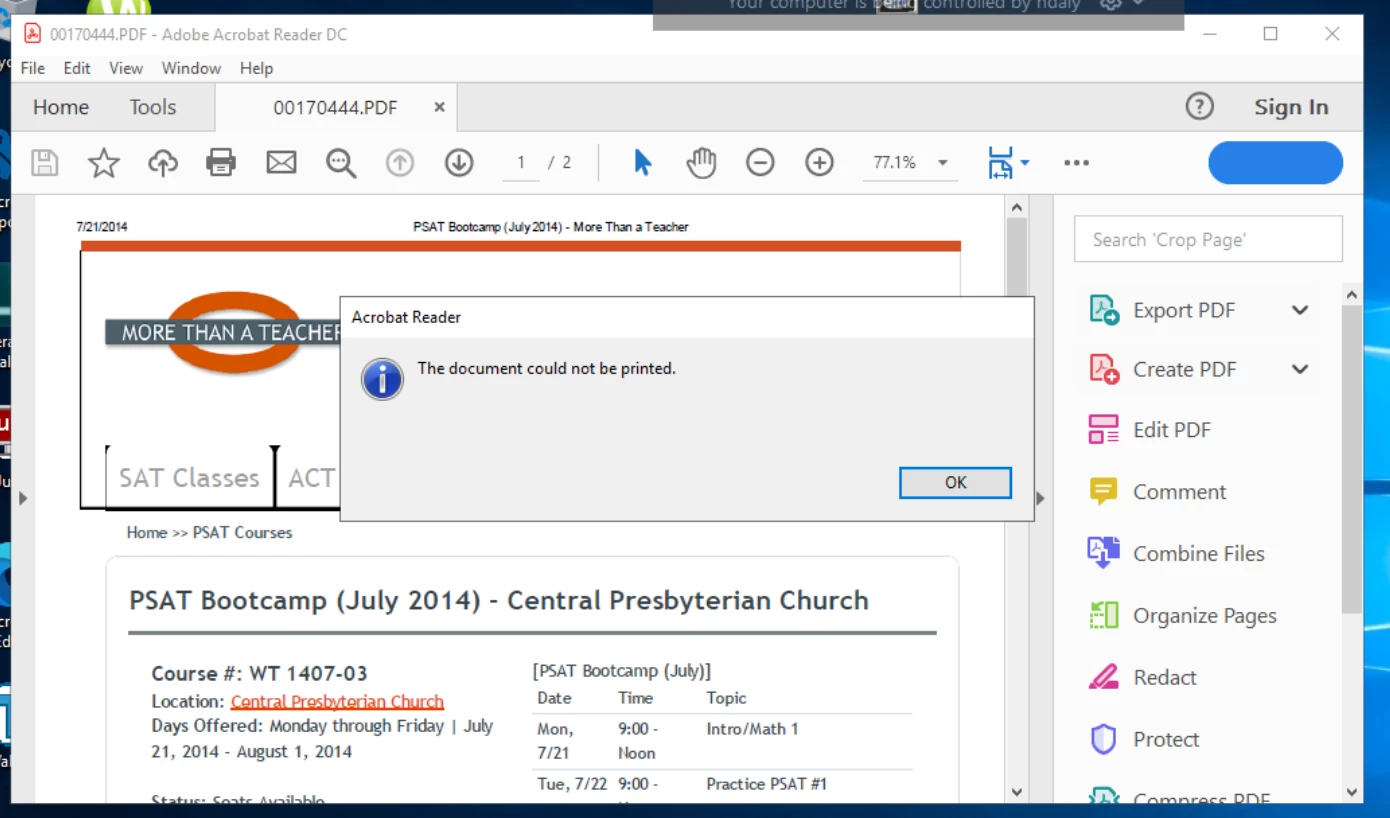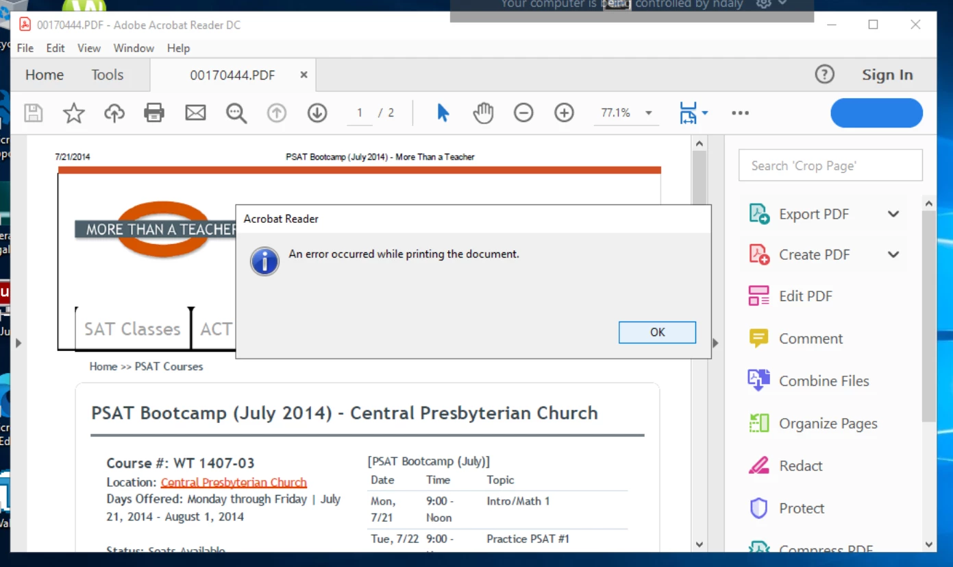 I click OK and this I get this pop-up. "An error occured while printing the document."