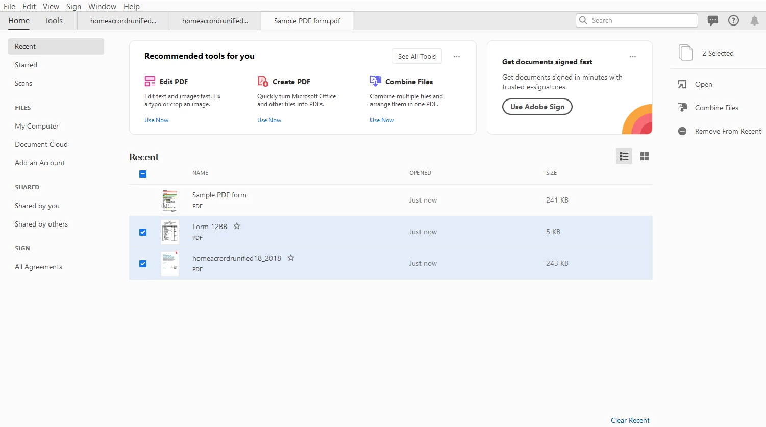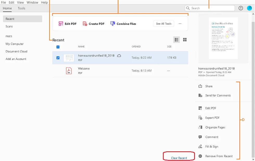 It is a unified list of files shared with you or shared by you for viewing, reviewing, or signatures in addition to the files opened for viewing from your computer, Document Cloud storage, or third-party storage like OneDrive, Dropbox, Box, SharePoint, and Google Drive. The files are labelled as Shared By You, Unshared or Shared By Others based on the action taken on the file. The comment icon next to a shared file’s name indicates that it’s a review file. If there’s no comment icon next to a shared file, then the file has been shared for viewing only.