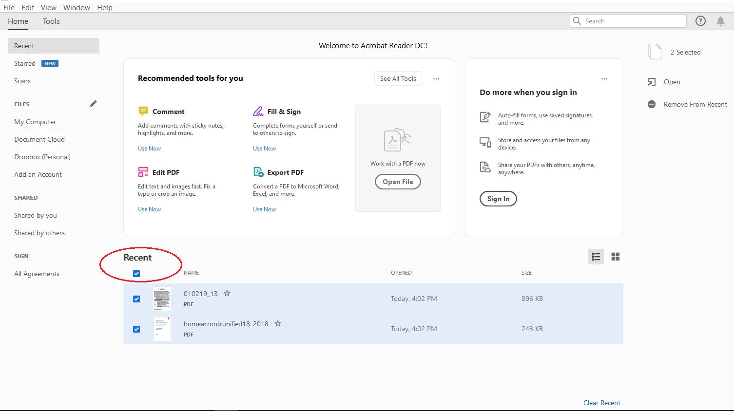 Want to delete a bunch of files or clear all the files display on Home view, every time you open Adobe Acrobat or Acrobat Reader DC? Here is a way to do that, but-