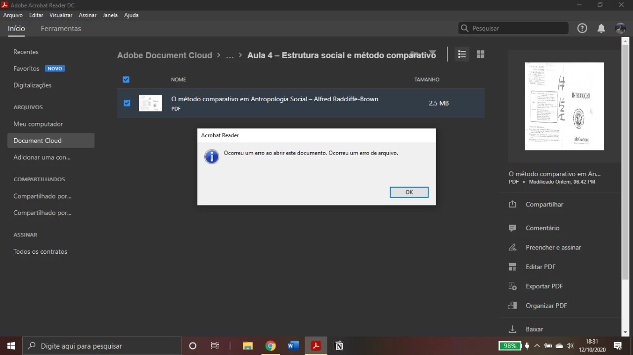 Ao tentar abrir os PDFs que foram salvos no Document Cloud até anteontem (11/10/2020) aparece a mensagem "Ocorreu um erro ao abrir este documento. Ocorreu um erro de arquivo.". Isso em qualquer dispositivo. Há arquivos muito importantes lá...