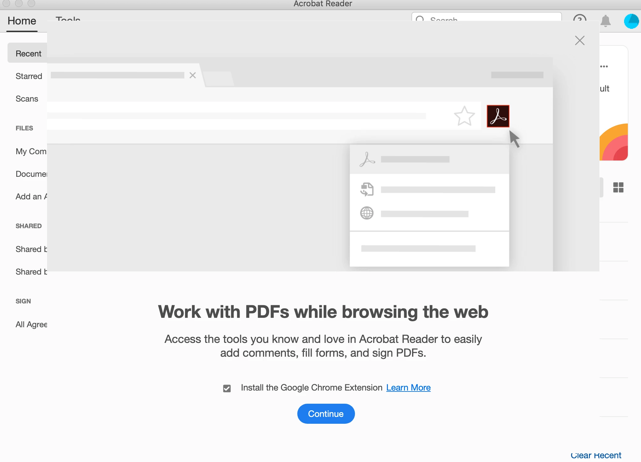 Acrobat Reader opens, asks if I want to make it default pdf software (no), and an ad pops up about installing the Chrome Acrobat plug-in - see attached. It doesn't fully load, and the only way to deal with it is to force-quit Acrobat. I tried opening it from the document also. Same thing.