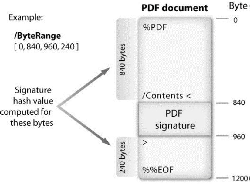 I use Adobe Reader to properly sign a PDF document. According to the entries in ByteRange, the upper section to be hashed is up to the beginning of the signature, NOT including the '<'. Similarly, the lower section to be hashed starts right after the '>'. Both '<' and '>' belong to neither the data to be hashed nor to the signature itself. However, the standard ETSI EN 319 142-2 V1.1.1 (2016-04) displays the following Fig A.1: