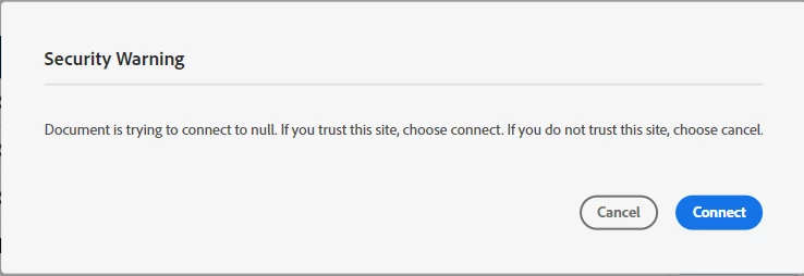 I have a interactive PDF created in Indesign with a button to submit form (PDF the complete document) to a email address. In Adobe Reader or Pro DC it works perfectly. On the adobe web plugin (Both Chrome & Edge) there is the below message, when you click connect this erroe appears.