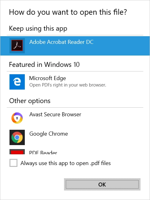 I just downloaded Acrobat Reader DC on my brand new "OK" HP Envy laptop. Every time I make a PDF, which is 15-20 times/day, there's a popup asking if I want to "Keep using this app." I've selected it and clicked "OK" dozens of times and still keeps popping up. I have the correct reader selected in my settings for Windows 10. I tried getting help from HP as well as Avast Support technicians with no resolution. I have this app on my other laptop as well as my PC and it works without issues. Can anyone help?