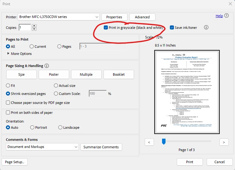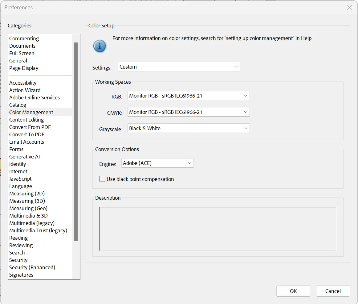 Everything was working fine when I was using the free Adobe reader.  We intalled Adobe Acrobat Pro yesterday and now the "Print in Grayscale" box doesn't work.  I have to go into my printer settings and change it to mono.  It doesn't even work when auto color is selected.  I really shouldn't have to go deep into printer settings every time I need to change from color to grayscale.  This problem only occurs in Adobe.   Is there a way to fix this or work around?