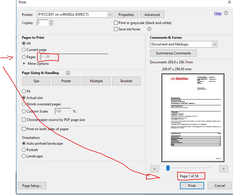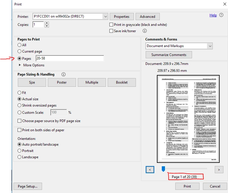 I would like to print the second section from page 20 to end (58), but it's printing from page 39 to end