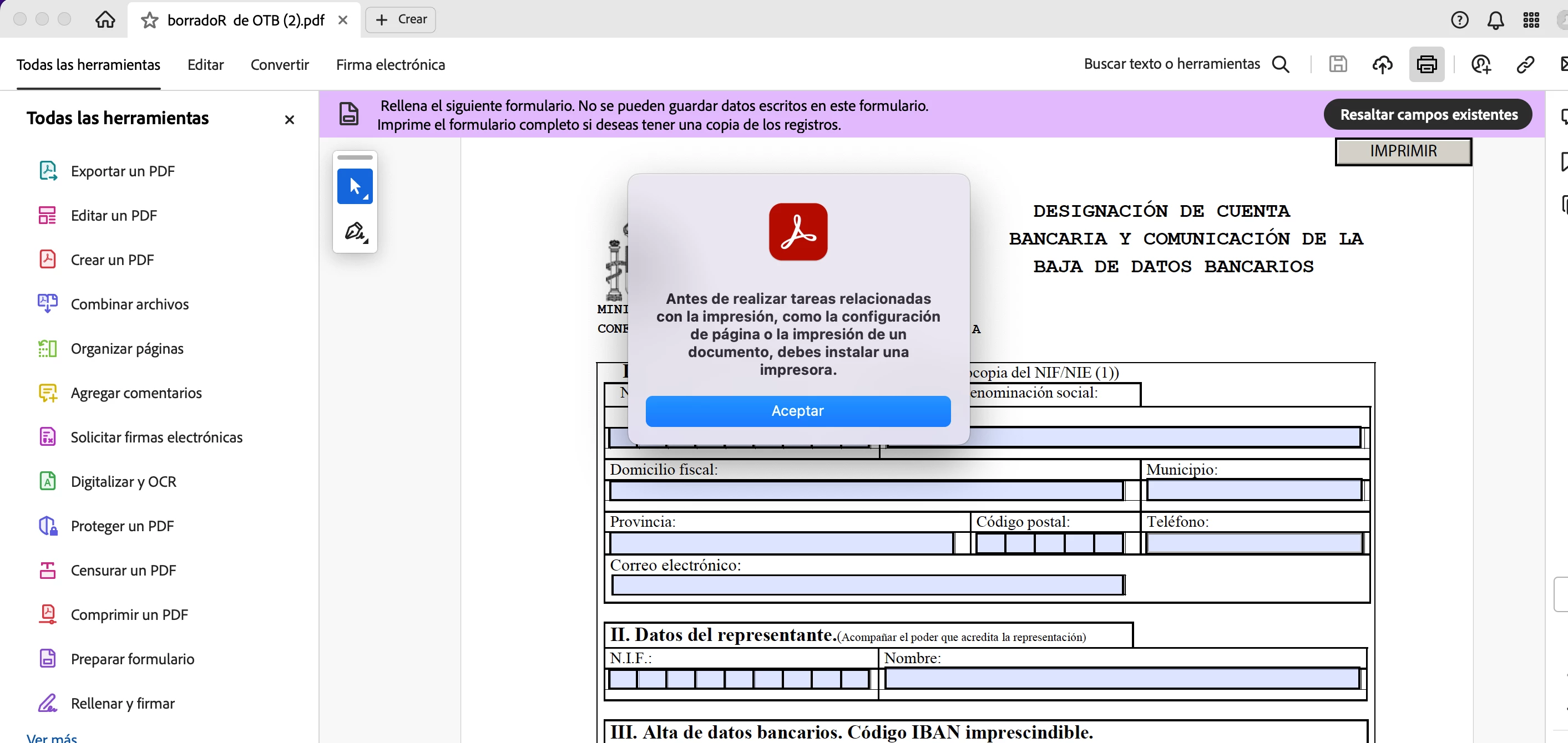 Cuando cumplimento un formulario que permite "guardar" y quiero imprimir a pdf para guardar los cambios me dice que tengo que tener una impresora instalada. Nunca he tenido una impresora instalada en el Mac y siempre he podido guardar los cambios en los archivos pdf con la opción de imprimir a pdf pero ahora ha desaparecido.