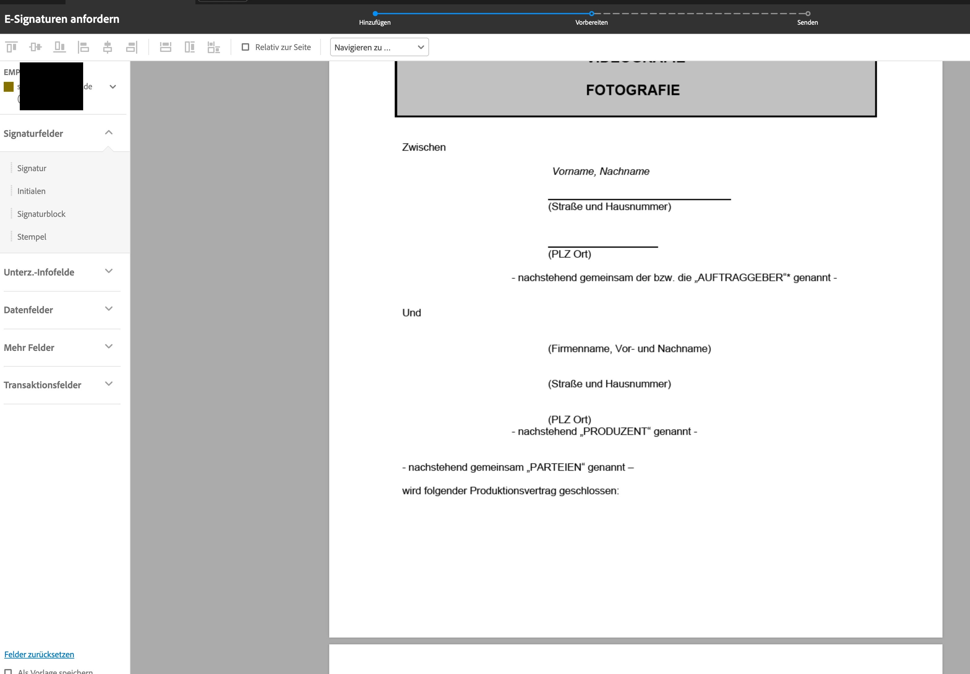 Das bedeutet, ich fülle also mein vorbereitetes Formular aus und drücke daraufhin auf "Elektronische Signaturen", mache meine Signatur und drücke danach aufn "E-Signatur Anfordern". Dann gebe ich die Empänger Mail an und drücke auf "Bereich für die Signatur festlegen". Daraufhin öffnet sich Safari und ich komme in den Bereich "Vorbereiten". Jetzt fängt das Problem an. Alle eintragungen, welche in den Formularfeldern vorgenommen wurden, sind weg. Als hätte ich nun eine Blanko Datei.