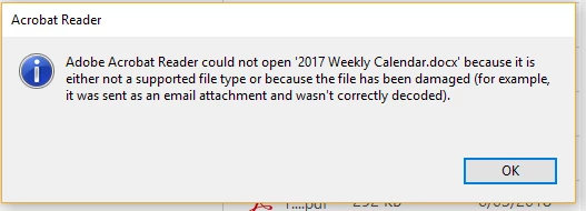 I started having trouble opening Adobe PDF files and get a message saying that "Adobe Acrobat could not open XXXXXDocx because it is either not a supported file type or because the file has been damaged (for example it was sent as an email attachment and wasn't decoded correctly) - this is not the case as I have been working with these files forever, I need help!