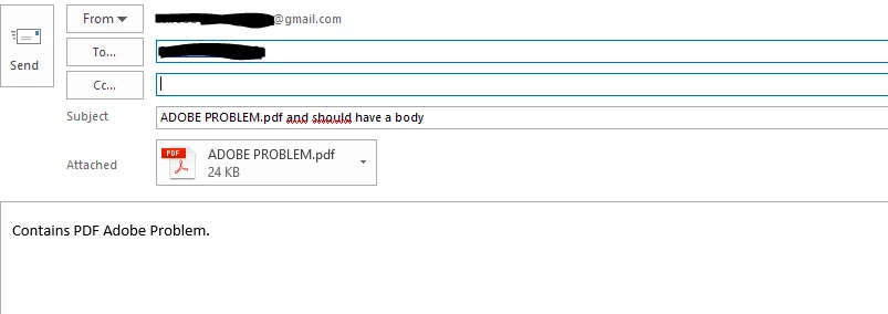 When i'm trying to send a mail from adobe acrobat reader DC (version 2018.009.20050) it opens a new mail message and the PDF gets attached but when I type in a body for the mail and send it, the body of the mail doesn't show on the receivers end. The pdf is received and the pictures of the signature are also shown in the attachment section but nothing of the actual text is received. I tried it with an outlook 2010 version and there it works normally. Also when I attach a pdf the normal way (not directly from adobe reader) it works as expected.